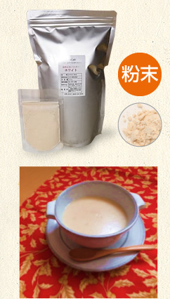 大さじ山盛り1杯の「ホワイト」を少量の水で練るように溶き、150ccの水かお湯を入れてひと煮立ちさせ、塩少々で味を調えると、とろみがついた優しい味わいのスープが簡単に出来上がります。お湯の代わりに牛乳や豆乳に替えるとポタージュ風になります。その他、汁物のとろみづけやホワイトソース、カレーのルー、お菓子作りの材料、お砂糖とお塩少々をまぜてキナコのように。。。などなどアイディア次第でさまざまに展開できます。